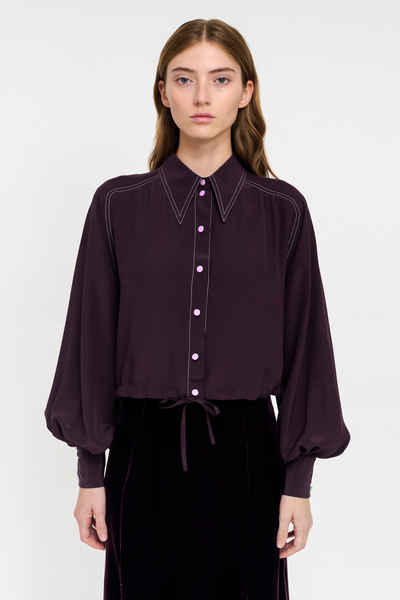 Inspired by 70s silhouettes, the Roller Mini Shirt features a pointed collar, raglan sleeves, and a cropped fit. Crafted from upcycled silk crêpe de chine, it is enriched by contrasting cream stitching and finished with pink silk-covered buttons.