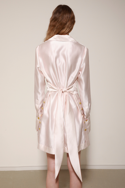 The LouLou Mini Dress features an essential 90’s cut, with a flat collar and extra-large cuffs. The two-sided silk button closures create multiple slit length options, and the adjustable double belts can be tied around the waist in different ways. The dress is cut from antique striped jacquard sourced in Como.